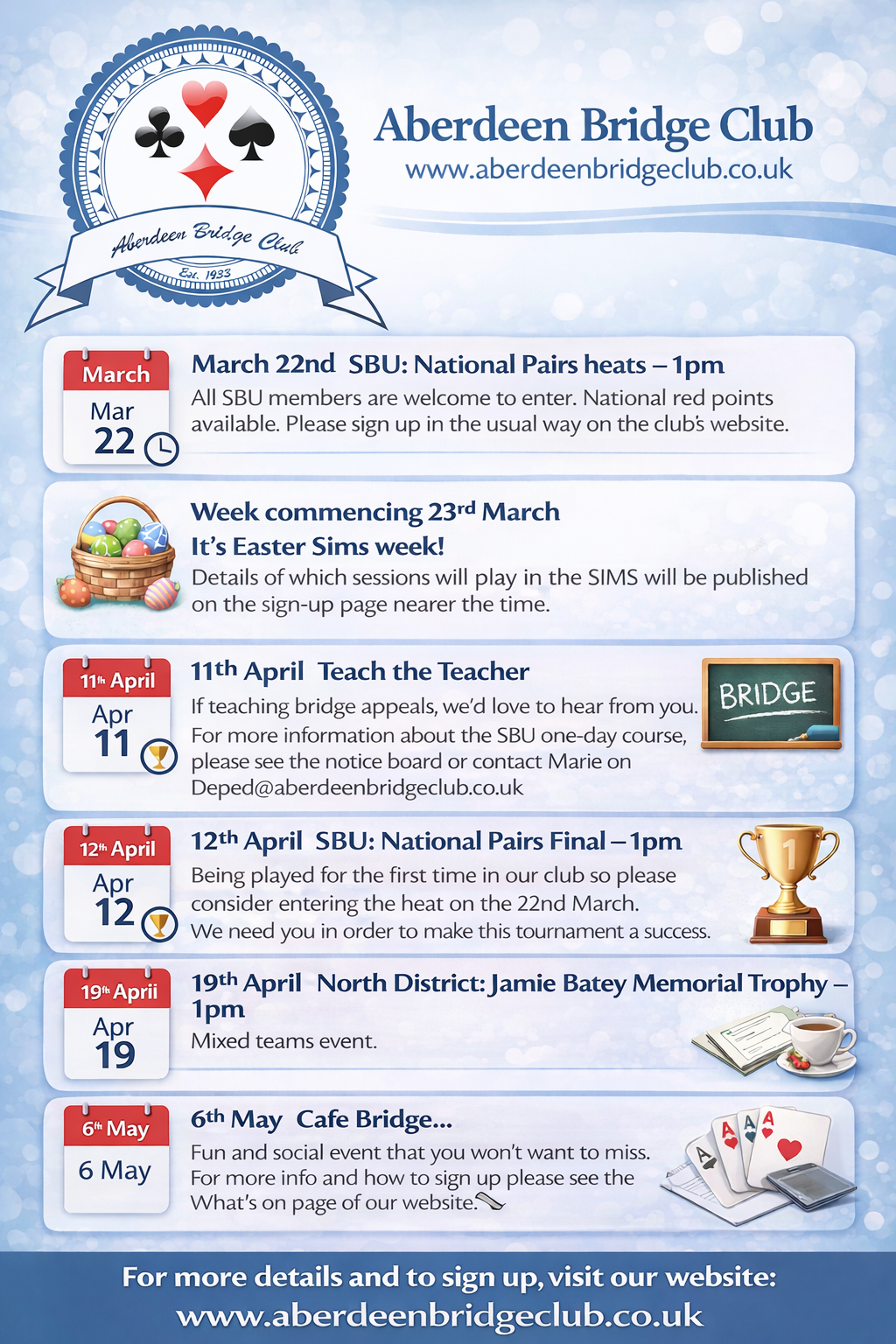 If you have any queries on any of our posts, please contact Brian on secretary@aberdeenbridgeclub.co.uk